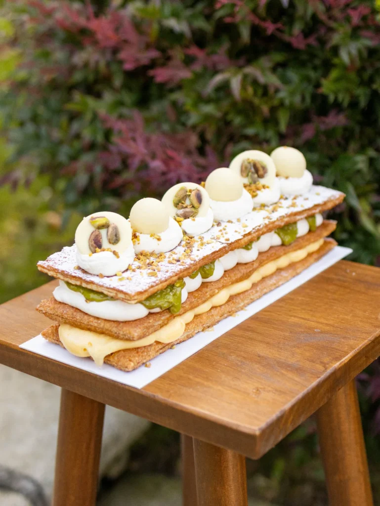 Bizcocho de chocolate, mousse de pistacho, crujiente de pistacho y frutos secos, cremoso de pistacho y ganache de chocolate blanco.