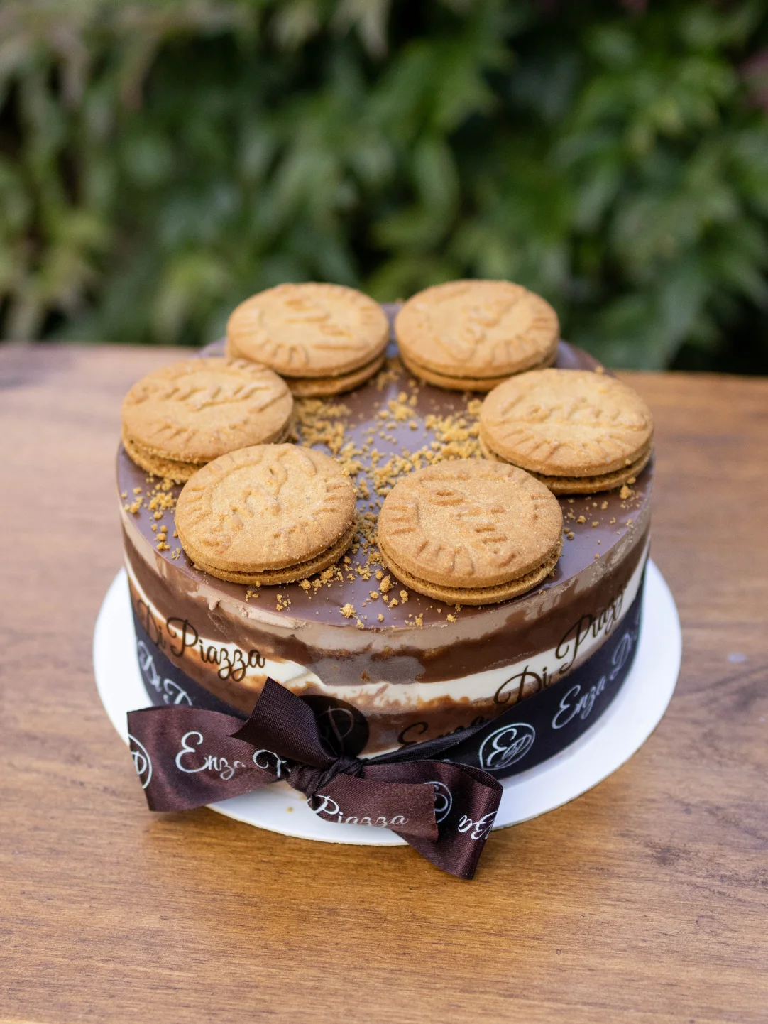 Galleta en leche, crema diplomática y crema suave de chocolate. Lleva también galleta lotus.
