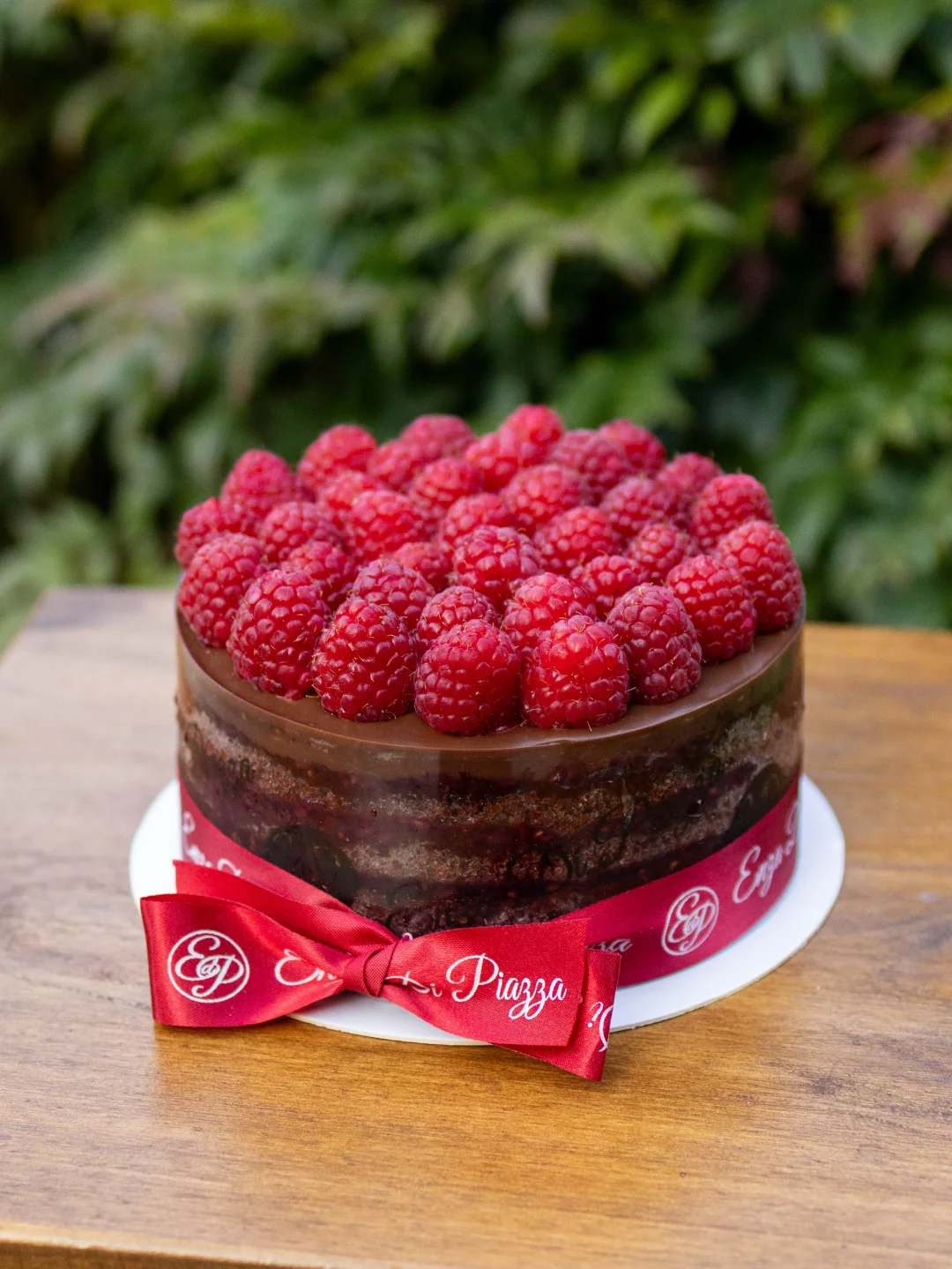 Bizcocho de chocolate, mermelada de frambuesa, ganache de chocolate y frambuesa natural.