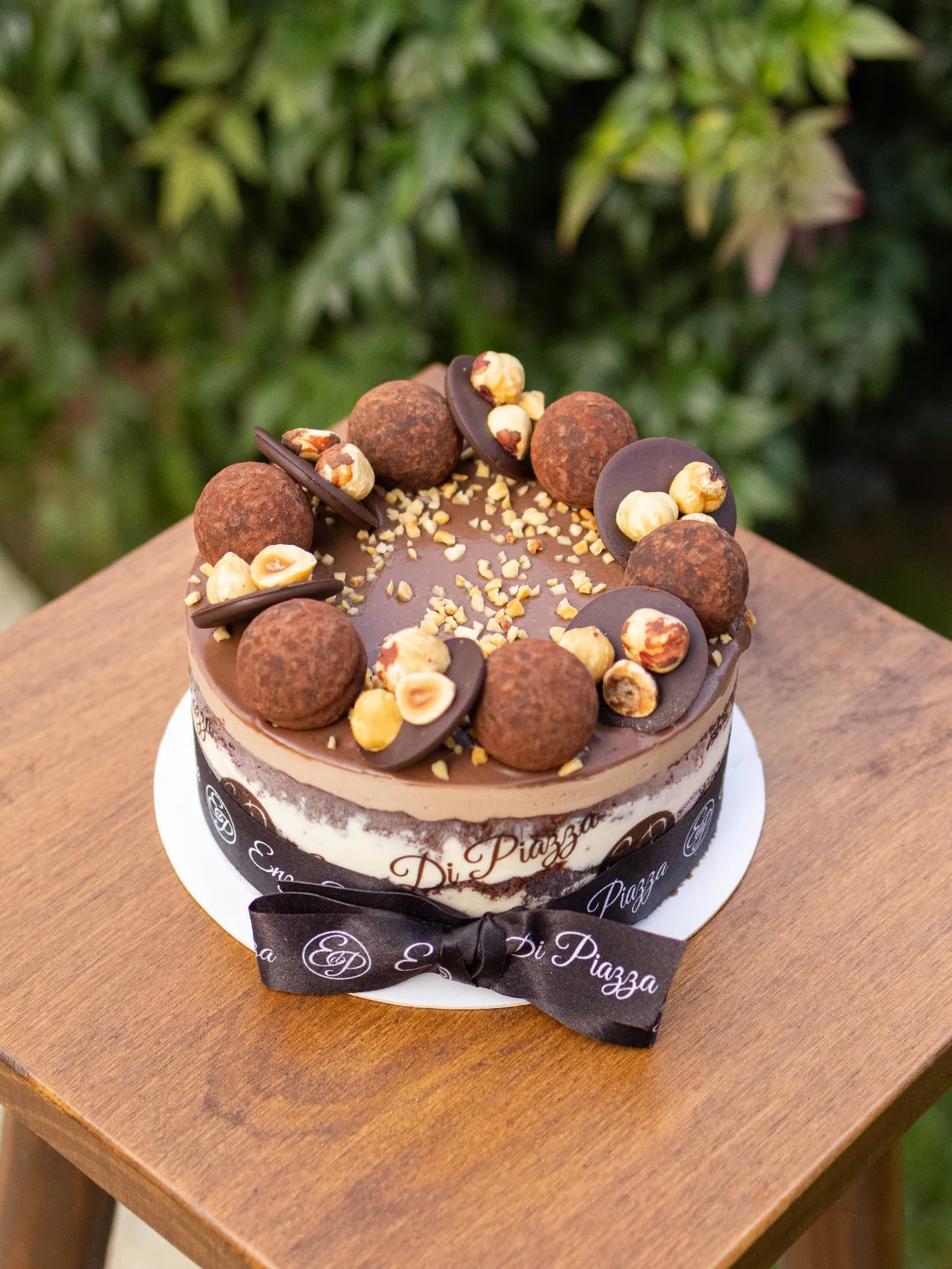 Bizcocho de chocolate, mousse de avellana, crujiente de chocolate y frutos secos, crema diplomática y ganache de chocolate.