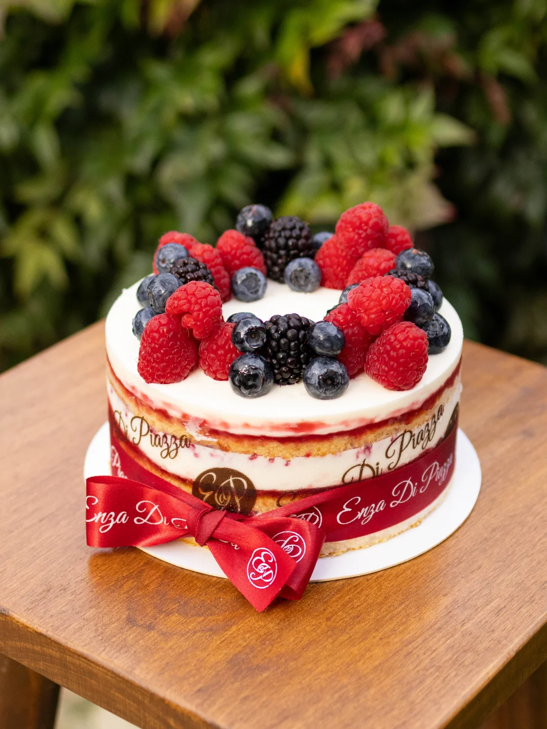 Bizcocho de yogur, mermelada de frambuesa, frosting de queso crema, frambuesa, mora y arándanos.