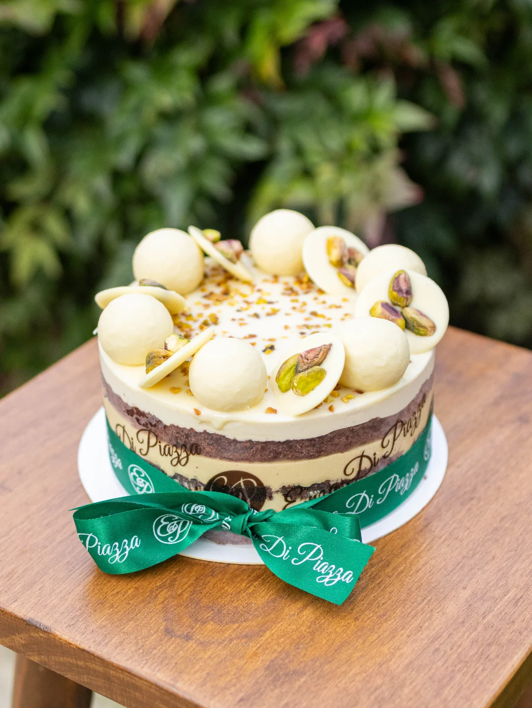 Bizcocho de chocolate, mousse de pistacho, crujiente de pistacho y frutos secos, cremoso de pistacho y ganache de chocolate blanco.